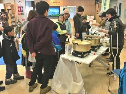 イベントのメインは、餅つき大会。地元の餅米を使い大勢の子供たちが順番にきねを使って餅つきを体験。みんなでついたつきたての持ちをきなこ餅や雑煮にして無料でみなさんに味わってもらいました。