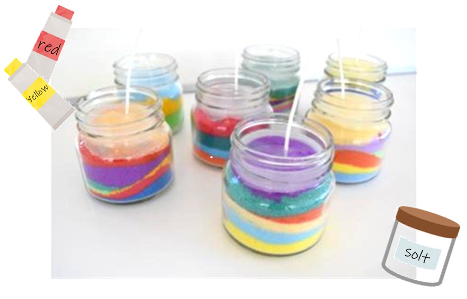 絵具で色付けした塩を小瓶の中に好きなように入れていきます。そしてその中に透明のロウを流し込んで出来上がり!!